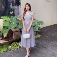 This stylish women's two-piece set combines a delicate top and a flowing skirt for effortless elegance. The cropped top features a soft pastel blue/gray fabric with a V-neckline and flutter sleeves, offering a feminine silhouette. The mid-calf skirt boasts a geometric lattice design on the upper half, transitioning to sheer tulle fabric below for added movement and charm. Perfect for showcasing versatility in both casual and semi-formal settings.