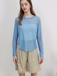 This light blue long-sleeve mesh top features breathable mesh fabric with a round neckline and loose silhouette. The curved slit hem breaks traditional monotony, adding dynamic charm. Crafted from premium mesh material, it balances breathability and softness – perfect for modern women seeking comfort and style.