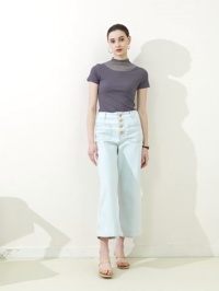 This women's short-sleeve T-shirt features a high-neck and semi-transparent mesh panel design, blending elegance with modern style. The main body uses soft, skin-friendly gray knit fabric with fine vertical stripes to enhance texture and breathability. The lightweight mesh back adds dimension to the silhouette, perfect for those seeking both fashion and comfort.
