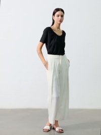Crafted from premium soft fabric, this versatile V-neck short-sleeve top combines timeless elegance with everyday comfort. The relaxed fit and subtle pleated neckline add a feminine touch, while the sleek black color effortlessly complements any outfit. Paired with crisp white trousers in the showcase, it epitomizes modern minimalist style.