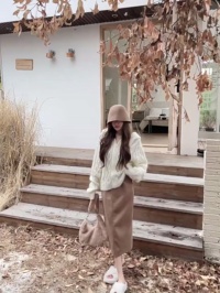 This mid-calf suede skirt combines timeless elegance with effortless sophistication. Crafted from premium soft suede fabric, it features a straight-cut silhouette with a high waistline and two functional patch pockets on the front. The neutral beige-brown hue and clean vertical seams enhance its versatility, making it a wardrobe staple for diverse styles.