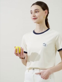 This classic crew-neck T-shirt features a soft beige base with striking black contrast trim on the neckline and sleeves, delivering a timeless two-tone aesthetic. Adorned with a whimsical cartoon character embroidery on the left chest (a stylishly dressed figure with a speech bubble), it combines playful charm with refined simplicity. Crafted from premium cotton for breathability and comfort, the relaxed fit ensures effortless style for all body types.