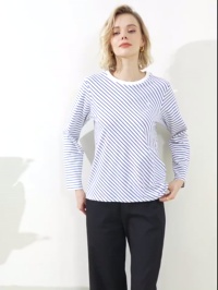 This women's long-sleeve striped T-shirt features a classic white base with eye-catching diagonal blue stripes, crafted from soft, breathable fabric for all-day comfort. The round neckline and relaxed fit offer a versatile, stylish look, while a subtle branded logo adds a touch of elegance on the left chest. Perfect for layering or standalone wear, it combines timeless design with modern comfort.