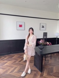 This delicate two-piece set features a floral-printed blouse and skirt crafted from lightweight fabric, ideal for spring and summer wear. The blouse showcases a V-neckline with lace trim, long bishop sleeves, and a cinched waist with buttons, paired with a high-waisted skirt boasting tiered ruffles and a soft drape. Both pieces share a harmonious floral motif in soft pastel tones, blending femininity with timeless elegance.